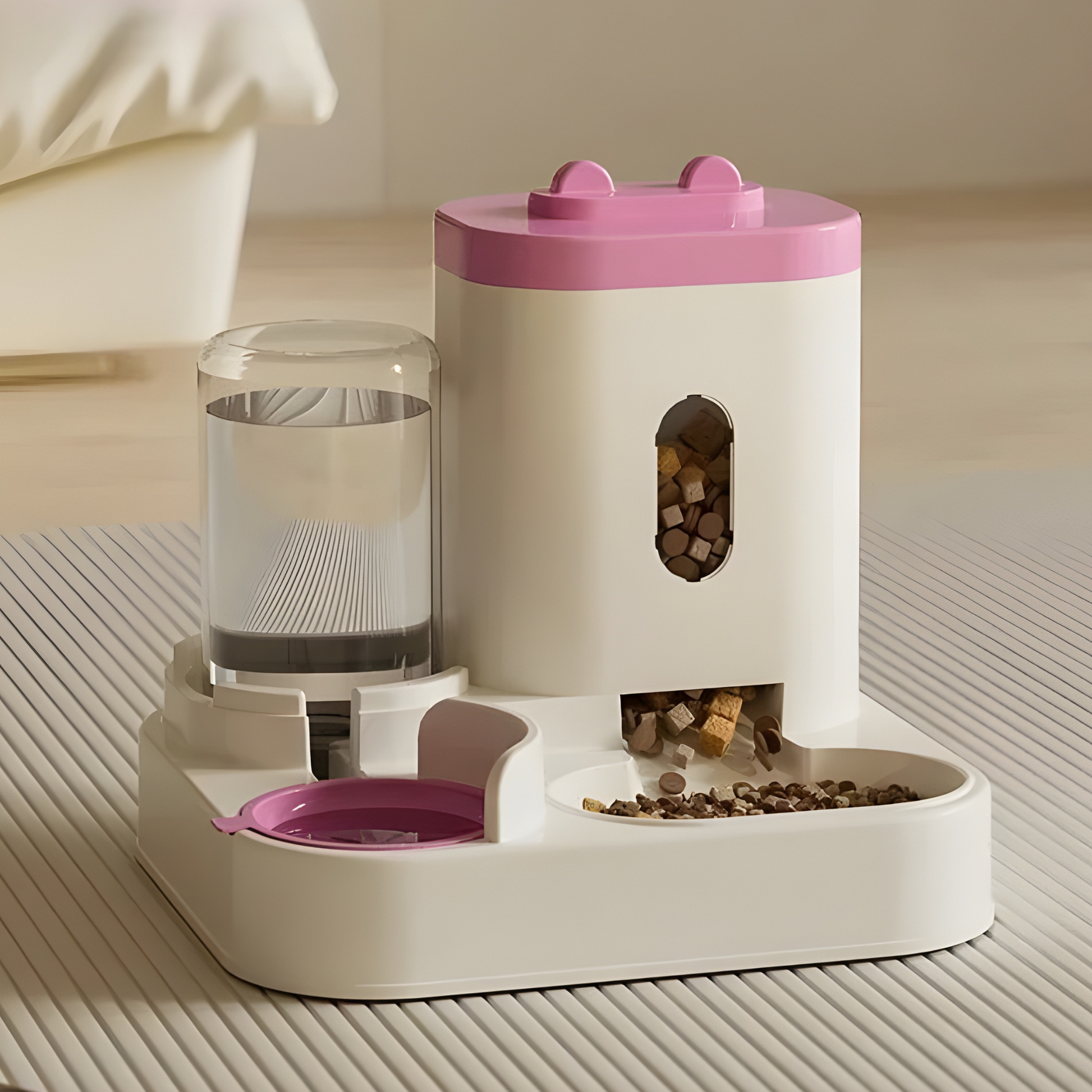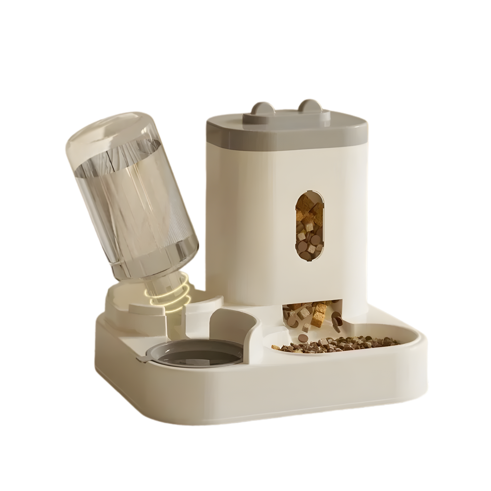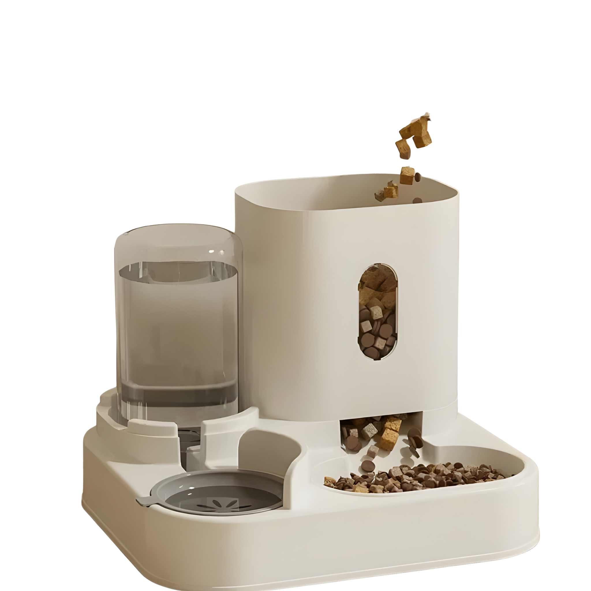 - 💧 Sistema dual de comida + fuente de agua en un diseño compacto que ahorra espacio en tu hogar.