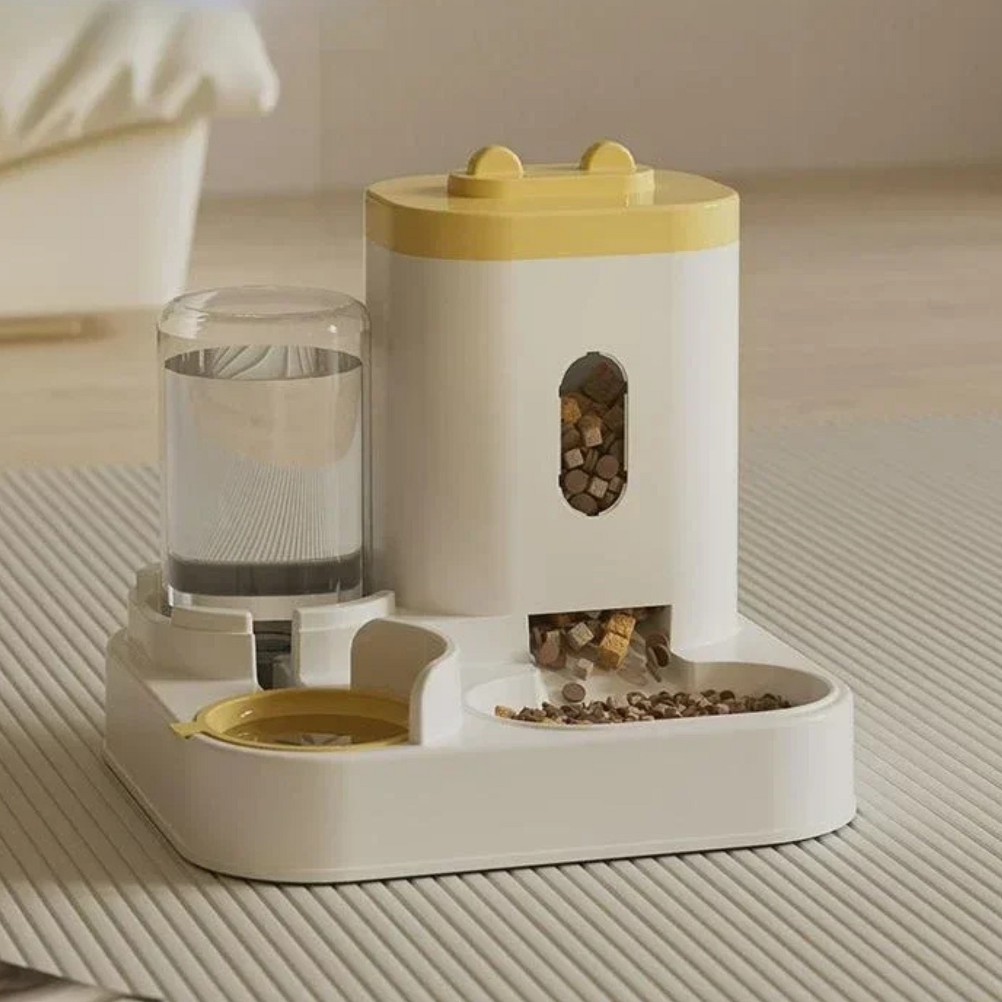 Cuenco de comida y fuente de agua integrados en un diseño compacto que ahorra espacio y mantiene la zona de alimentación organizada.